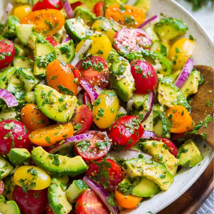 میکس کاهو، کینوا، روکولا، سورل، جعفری فری آووکادو، گوجه چری، سیب درختی، پنیر محلی، سس آووکادو