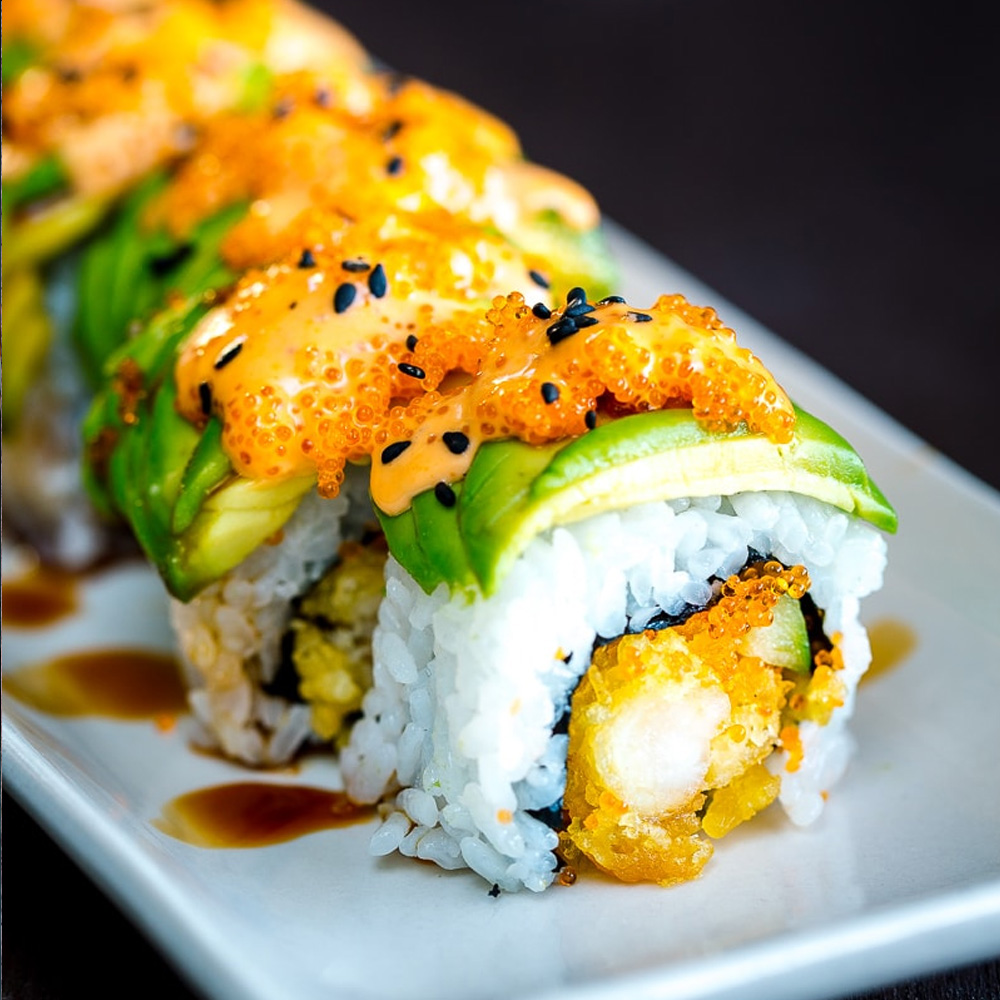 یک رول ۸ تکهای، برنج ژاپنی، میگو سوخاری شده، سالمون نروژی، خیار، آووکادو، مایونز ژاپنی، پودر پانکو