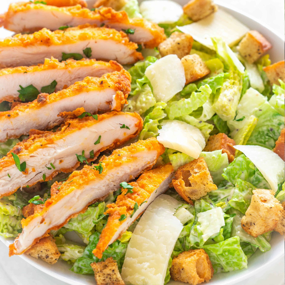 میکس کاهو، مرغ مزه دار شده سوخاری، کروتان (نان سیر)، پنیر پارمسان، سس سزار، زیتون